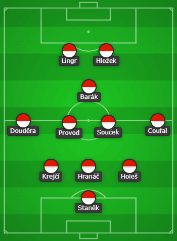ยินดริช สตาเน็ค – โทมัส โฮเลส, โรบิน ฮรานัก, ลาดิสลาฟ เครจชี่ – วลาดิมีร์ ซูฟาล, โทมัส ซูเช็ค, อันโตนิน บารัค, ลูคัส โพรวอด, เดวิด ดูเดร่า – อดัม ฮโลเฉค, ออนเดร็จ์ ลิงเกอร์