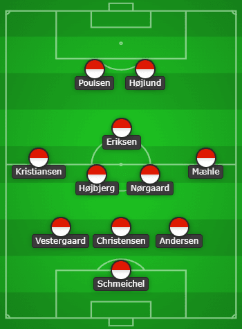 แคสเปอร์ ชไมเคิล – โยอาคิม แอนเดอร์เซ่น, อันเดรียส คริสเตนเซ่น, ยานนิค เวสเตอร์การ์ด – โยอาคิม เมห์เลอ, คริสเตียน นอร์การ์ด, คริสเตียน เอริคเซ่น, ปิแอร์-เอมิล ฮอยเบียก์, วิคเตอร์ คริสเตียนเซ่น – ราสมุส ฮอยลันด์, ยุสซุฟ โพลเซ่น