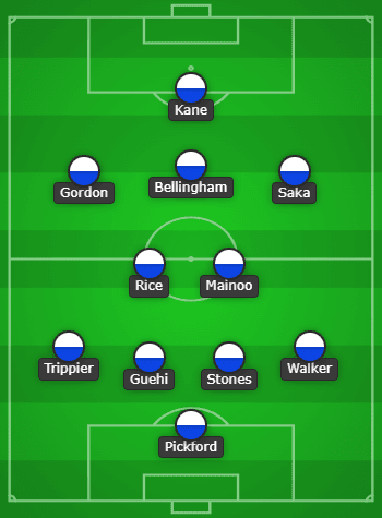 จอร์แดน พิคฟอร์ด – ไคล์ วอล์คเกอร์, จอห์น สโตนส์, มาร์ค เกฮี, ลุค ชอว์ – ค็อบบี้ เมนู, เดแคลน ไรซ์ – บูกาโย่ ซาก้า, จู๊ด เบลลิงแฮม, แอนโธนี่ กอร์ดอน – แฮร์รี่ เคน