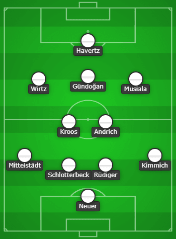 มานูเอล นอยเออร์ – โยชัว คิมมิช, อันโตนิโอ รูดิเกอร์, นิโก้ ชล็อตเตอร์เบค, มักซิมิลเลียน มิทเทิลชเตดท์ – โรเบิร์ต อันดริช, โทนี่ โครส – จามาล มูเซียล่า, อิคคาย กุนโดอัน, ฟลอเรียน เวียร์ตซ – ไค ฮาแวร์ตซ