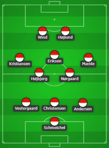 แคสเปอร์ ชไมเคิล – โยอาคิม แอนเดอร์เซ่น, อันเดรียส คริสเตนเซ่น, ยานนิค เวสเตอร์การ์ด – โยอาคิม เมห์เล่, มอร์เทน ยูลแมนด์, คริสเตียน เอริคเซ่น, ปิแอร์-เอมิล ฮอยเบียก์, วิคเตอร์ คริสเตียนเซ่น – ราสมุส ฮอยลันด์, โยนัส วินด์