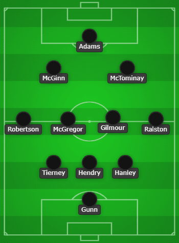 แองกัส กันน์ – แกรนท์ แฮนลี่ย์, แจ็ค เฮนดรี้ – คีแรน เทียร์นีย์ – แอนโทนี่ ราลสตัน, คัลลั่ม แม็คเกรเกอร์, บิลลี่ กิลมอร์, แอนดี้ โรเบิร์ตสัน – สก็อตต์ แม็คโทมิเนย์, จอห์น แม็กกินน์ – เช อดัมส์