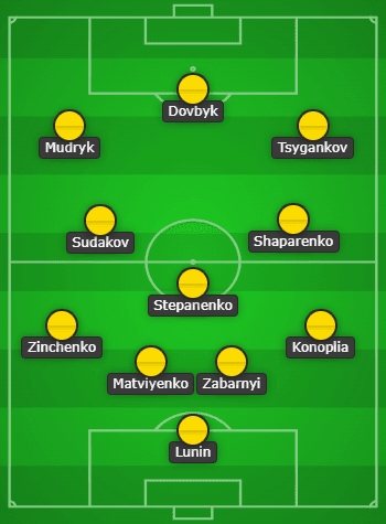 อังเดร ลูนิน – ยุคัม โคโนปลีย่า, อิลยา ซาบาร์นี, มิโคลา มัตวิเยนโก้, โอเล็กซานเดอร์ ซินเชนโก้ – มิโคล่า ชาปาเรนโก, ทาราส สเตปาเนนโก้, จอร์จี้ ซูดาคอฟ – วิคเตอร์ ซีกันคอฟ, อาร์เต็ม ดอฟบิค, มิไคโล มูดริก