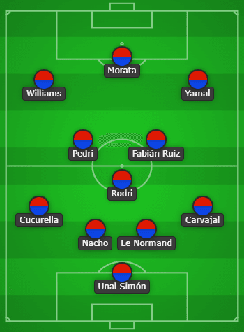 อูไน ซิมอน – ดานี การ์บาฆาล, โรบิน เลอ นอร์มันด์, นาโช่, มาร์ค คูคูเรญ่า – ฟาเบียน รุยซ์, โรดรี้, เปดรี้ – ลามีน ยามาล, อัลบาโร่ โมราต้า, นิโก้ วิลเลียมส์
