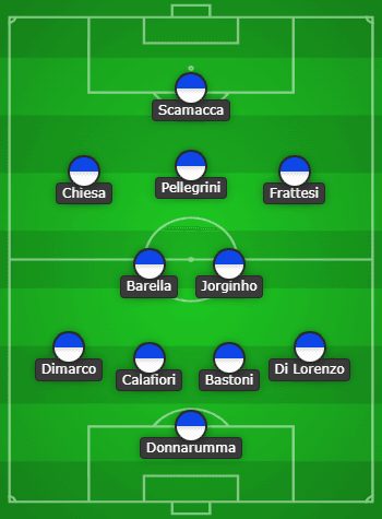 จานลุยจิ ดอนนารุมมา – โจวานนี ดิ ลอเรนโซ, อเล็กสซานโดร บาสโตนี่, ริคคาร์โด้ คาลาฟิออรี, เฟเดริโก ดิมาร์โก – นิโกโล บาเรลลา, จอร์จินโญ่ – ดาวิเด้ ฟรัตเตซี่, ลิเรนโซ่ เปเยกรินี่, เฟเดริโก้ เคียซ่า – จานลูก้า สกามัคก้า