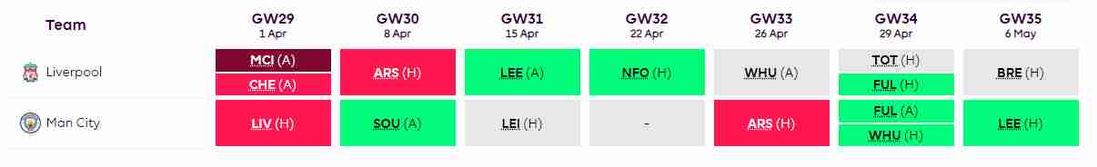 สำหรับโปรแกรมนับตั้งแต่เกมวีก 29 เป็นต้นไปของทั้ง แมนฯ ซิตี้ และ ลิเวอร์พูล มีดังนี้