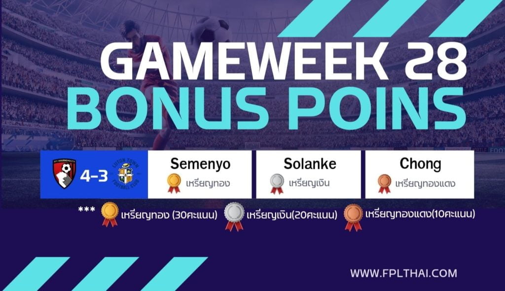 สรุปคะแนนโบนัส FPLTHAI – GW28 คู่วันที่ 13 มี.ค. 2567