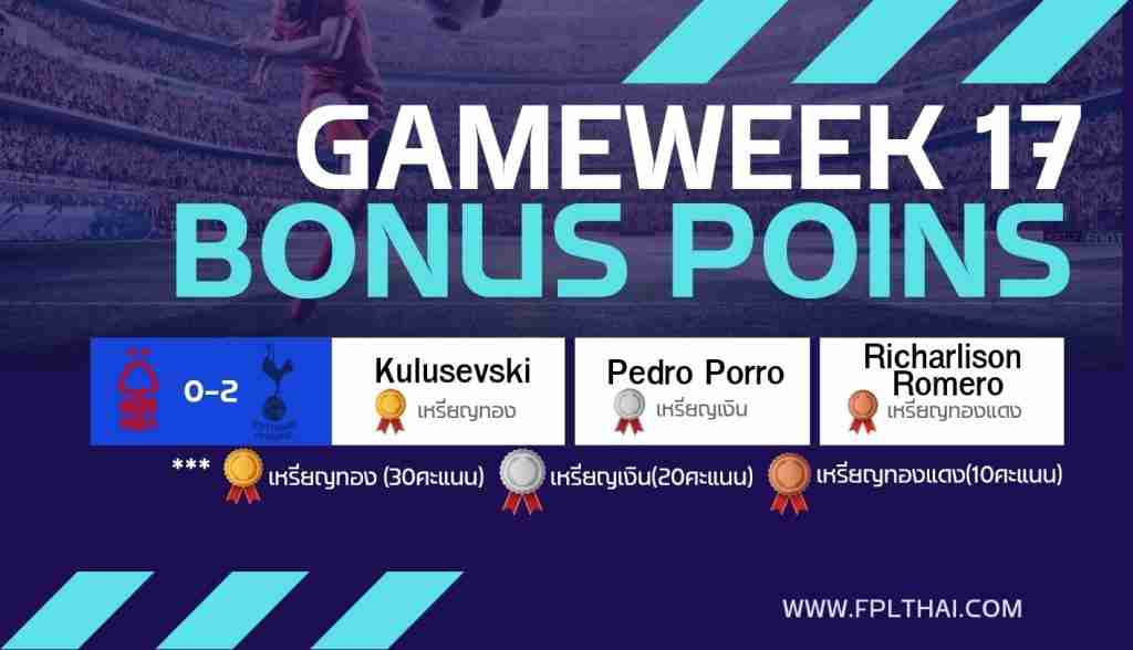 สรุปคะแนนโบนัส FPLTHAI – GW17 คู่วันที่ 15 ธ.ค. 2566