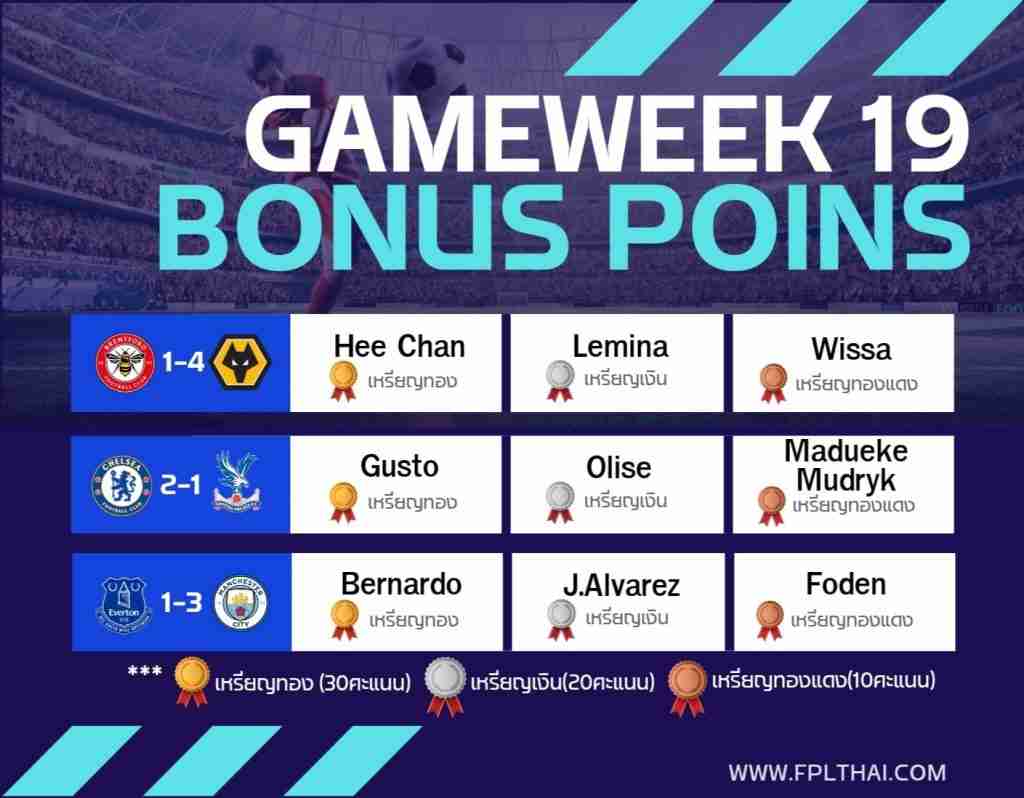 สรุปคะแนนโบนัส FPLTHAI – GW19 คู่วันที่ 27 ธ.ค. 2566