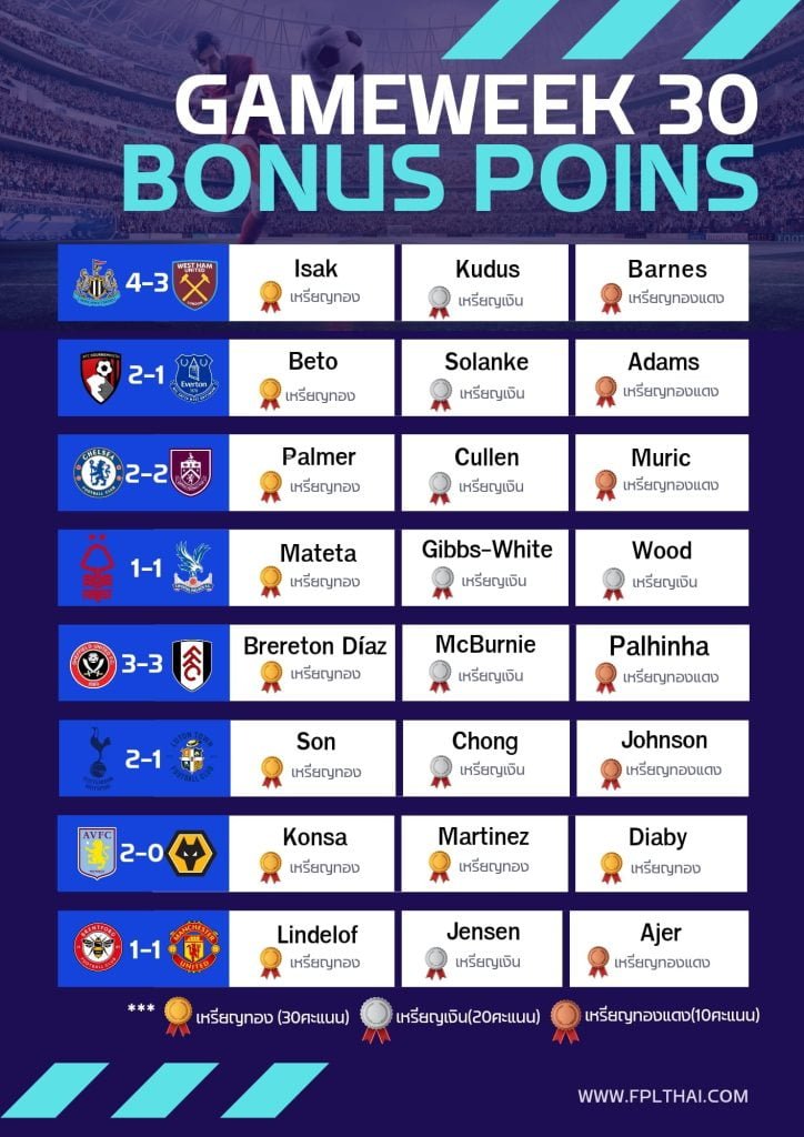 สรุปคะแนนโบนัส FPLTHAI – GW30 คู่วันที่ 30 มี.ค. 2567