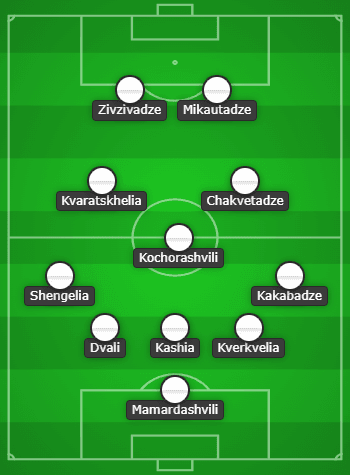 จอร์จี้ มามาร์ดาชวิลี่ เฝ้าเสา กองหลัง ลาช่า ดวาลี่, กูราม คาเชีย และ โซโลมอน คเวอร์คเวเลีย คุมเกม มิดฟิลด์ โอตาร์ คาคาบัดเซ่, จอร์จี้ โคโชราชวิลี่, อันซอร์ เมควาบิชวิลี่, จอร์จี้ ชัคเวตัดเซ่ และ จอร์จี้ ซิตาอิชวิชี่ ประสานงาน กองหน้า ควิช่า ควารัตสเคเลีย ล่าตาข่ายกับ จอร์เจส มิเคาตัดเซ่