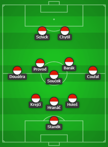 จินดริช สตาเน็ค – โทมัส โฮเลส, โรบิน ฮรานัก, ลาดิสลาฟ เครจชี่ – วลาดิมีร์ ซูฟาล, อันโตนิน บารัค, โทมัส ซูเช็ค, ลูคัส โพรวอด, เดวิด ดูเดร่า – มอยเมียร์ คีติล, ปาทริค ชิค