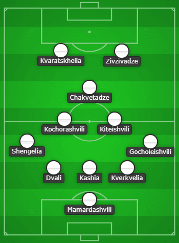 จอร์จี้ มามาร์ดาชวิลี่ – เลวาน เชนเกเลีย, ลาชา ดวาลี, กูราม คาเชีย, โซโลมอน คเวียร์เควเลีย, จอร์จี้ โกโชเลชวิลี – โอตาร์ คิเตชวิลี, จอร์จี้ โคโชราชวิลี่, จอร์จี้ ชัคเวตาดเซ่ – ควิชา ควารัตสเคเลีย, บาดู ซิฟซิวาดเซ่