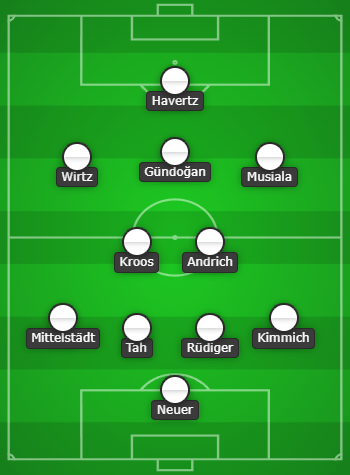 มานูเอล นอยเออร์ – โยชัว คิมมิช, อันโตนิโอ รูดิเกอร์, โจนาธาน ทาห์, มักซิมิลเลียน มิทเทิลสตัดท์ – โรเบิร์ต อันดริช, โทนี่ โครส – จามาล มูเซียล่า, อิคคาย กุนโดอัน, ฟลอเรียน เวียร์ตซ – ไค ฮาแวร์ตซ