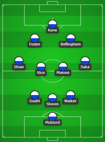 จอร์แดน พิคฟอร์ด – ไคล์ วอล์คเกอร์, จอห์น สโตนส์, มาร์ค เกฮี – บูกาโย่ ซาก้า, ค็อบบี้ เมนู, เดแคลน ไรซ์, ลุค ชอว์ – ฟิล โฟเด้น, จู๊ด เบลลิงแฮม – แฮร์รี่ เคน