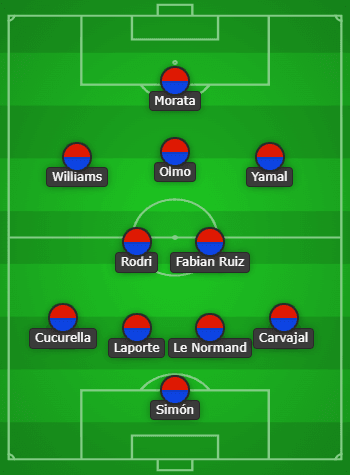อูไน ซิมอน – ดานี่ การ์บาฆาล, โรบิน เลอ นอร์กม็องด์, เอยเมริก ลาปอร์กต์, มาร์ค คูคูเรญ่า – โรดรี, ฟาเบียน รุยซ์ – ลามีน ยามาล, ดานี โอลโม่, นิโก้ วิลเลียมส์ – อัลบาโร่ โมราต้า