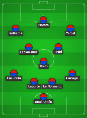 อูไน ซิมอน – ดานี การ์บาฆาล, โรบิน เลอ นอร์มันด์, เอยเมริก ลาปอร์กต์, มาร์ค คูคูเรญ่า – ฟาเบียน รุยซ์, โรดรี้, เปดรี้ – ลามีน ยามาล, อัลบาโร่ โมราต้า, นิโก้ วิลเลียมส์