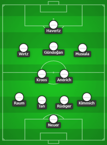 เยอรมัน ของ ยูเลี่ยน นาเกลส์มันน์ บดชนะเดนมาร์ก 2-0 ผ่านเข้ารอบได้สำเร็จ นัดนี้จะได้ โยนาธาน ทาห์ เซนเตอร์พ้นโทษแบนกลับมาจับคู่กับ อันโตนิโอ รูดิเกอร์ ทำให้ นิโค ชล็อตเทอเบ็ค กลับไปนั่งสำรองตามเดิม ส่วนแบ็คซ้าย เดวิด รอว์ม จะยึดแบ็คซ้ายตัวจริงอีกนัด