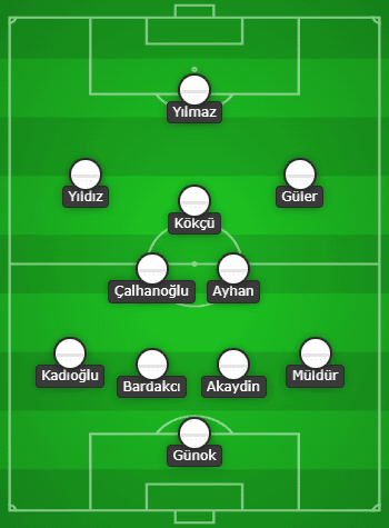 แมร์ท กูน็อค – คาน อายฮาน, เมรีห์ เดมิรัล, อับดุลเคริม บาร์ดัคเจอ, แฟร์ดี้ คาโดลู – ซาลีห์ ออซจัน, ฮาคาน ชัลฮาโนลู – อาร์ดา กูแลร์, เคนัน ยิลดิซ, เคเร็ม อัคตูโคลู – บาริส อัลแปร์ ยิลมาซ