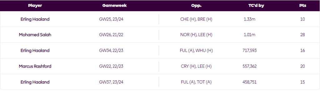 นอกจากนี้ฮาแลนด์ยังสร้างสถิติสำหรับทริปเปิล-กัปตันทีม เมื่อมีผู้เล่นกว่า 1.33 ล้านคน เลือกที่จะเพิ่มคะแนนของเขาเป็นสามเท่าในดับเบิ้ลเกมวีคที่ 25 (DGW25) สำหรับการเจอกับเชลซีและเบรนท์ฟอร์ดในเกมเปิดบ้านของแมนฯ ซิตี้