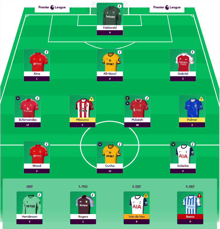 ทีมของจ่าฝูงนั้นปรากฏว่าไม่มีนักเตะค่าตัวแพงที่สุดของเกมอย่าง เออร์ลิ่ง ฮาแลนด์ ในทีม โดยเลือก 3 กองหน้าฟอร์มแรงอย่าง มาเธอุส คุนญ่า, คริส วูด และโดมินิค โซลังกี้ ส่วนแดนกลางก็มีตัวหลักของทีมใหญ่เป็นแกนอย่าง โมฮาเหม็ด ซาลาห์, โคล พาลเมอร์ และบรูโน่ เฟอร์นานเดส