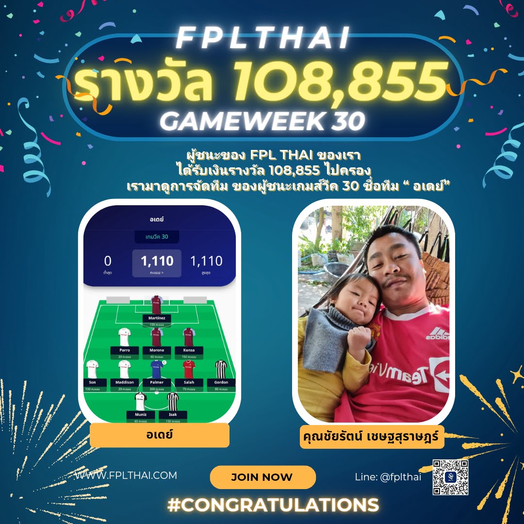 FPLTHAI เกมวีคที่ 30 (GW30) ได้ผู้ชนะไปเป็นที่เรียบร้อย ได้แก่ทีม อเดย์ ของคุณ ชัยรัตน์ เชษฐสุราษฎร์ ที่โกยแต้มไป 1,110 คะแนนในสัปดาห์นี้ คว้ารางวัลจำนวน 109,845 coin ไปครอง