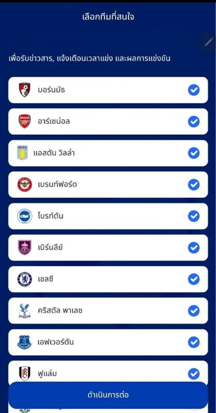 4. เลือกทีมที่สนใจ จะเลือกกี่ทีมก็ได้ / กดดำเนินการต่อ