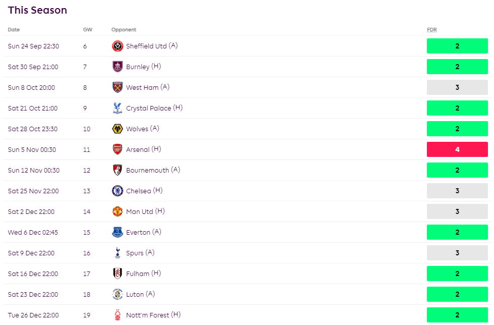 สาลิกาดงมีโปรแกรมที่มีค่าความยาก (FDR) อยู่ที่ 2-3 ถึง 13 จาก 14 สัปดาห์ต่อจากนี้ โดยมี อาร์เซน่อล เพียงทีมเดียวที่มีค่า FDR อยู่ที่ 4 ใน GW11 เท่านั้น