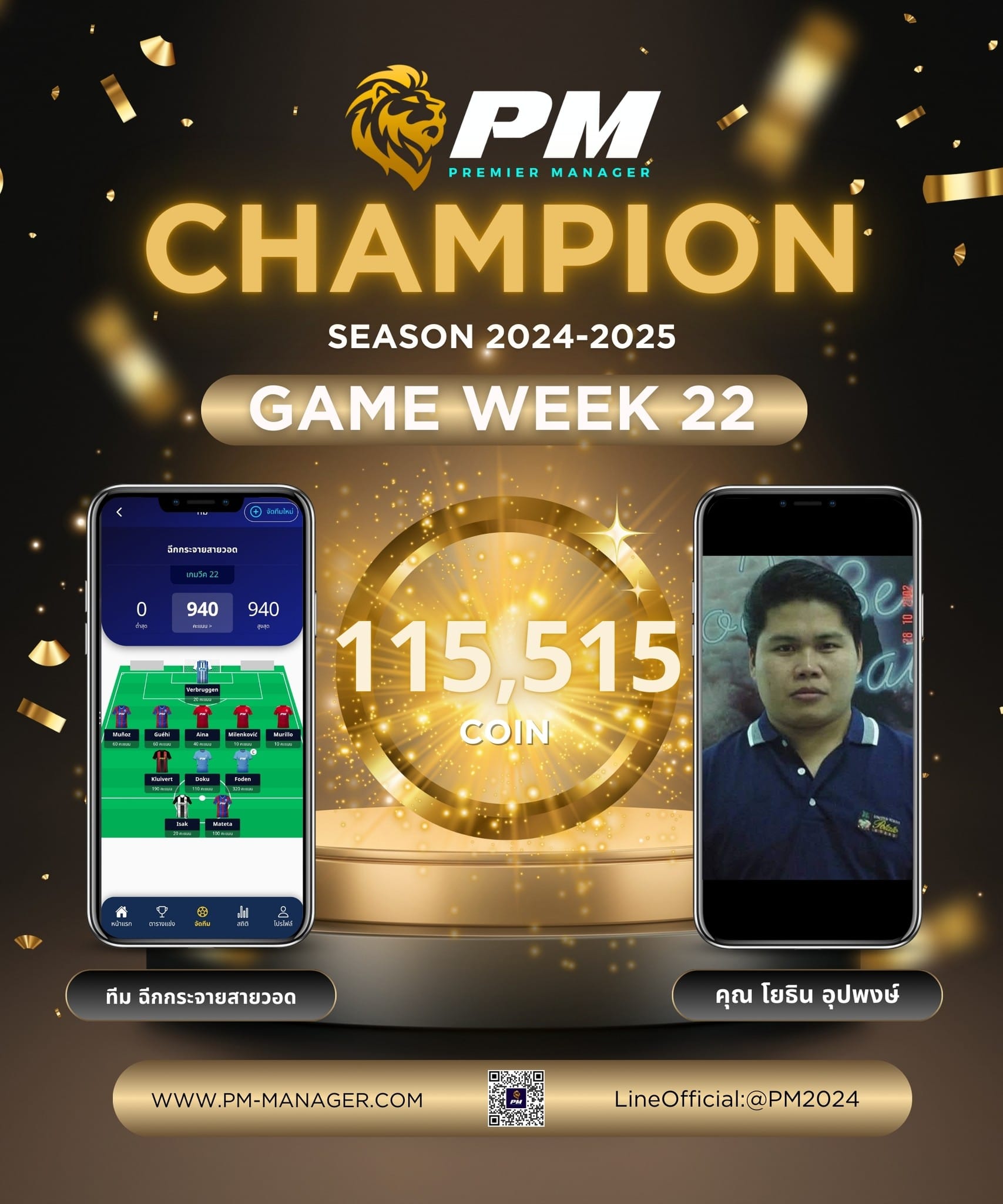 PM-Manager เกมวีคที่ 22 (GW22) ได้ผู้ชนะไปเป็นที่เรียบร้อย ได้แก่ทีม ฉีกกระจายสายวอด ของคุณ โยธิน อุปพงษ์ ที่โกยแต้มไป 940 คะแนนในสัปดาห์นี้ คว้ารางวัลจำนวน 115,515 coin ไปครอง
