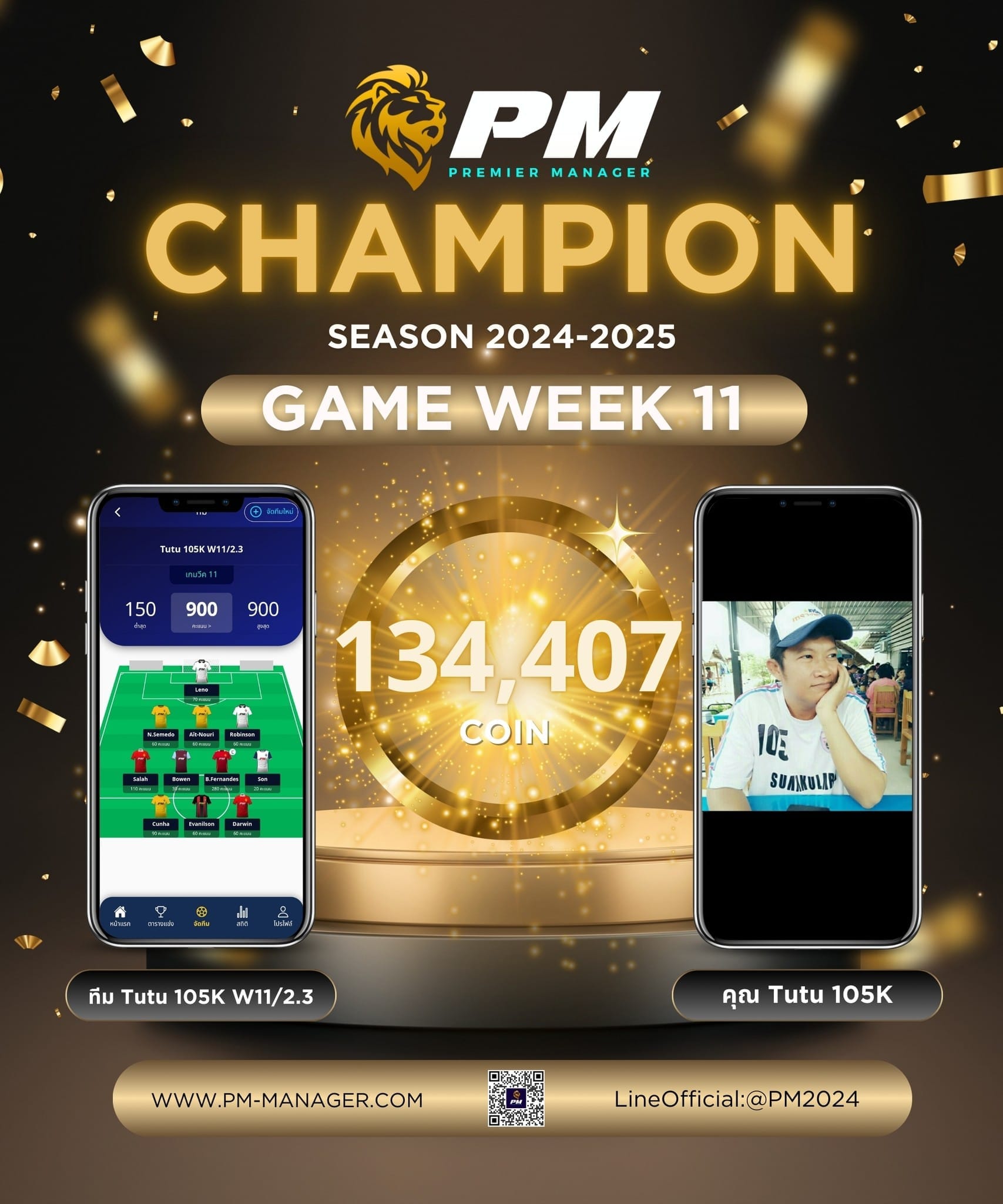 PM-Managerประกาศผู้ชนะฟุตบอลแฟนตาซี ประจำสัปดาห์ที่ 11 โดยเป็นทีม Tutu 105K W11/2.3 ที่ทำได้ 900 คะแนนในสัปดาห์นี้