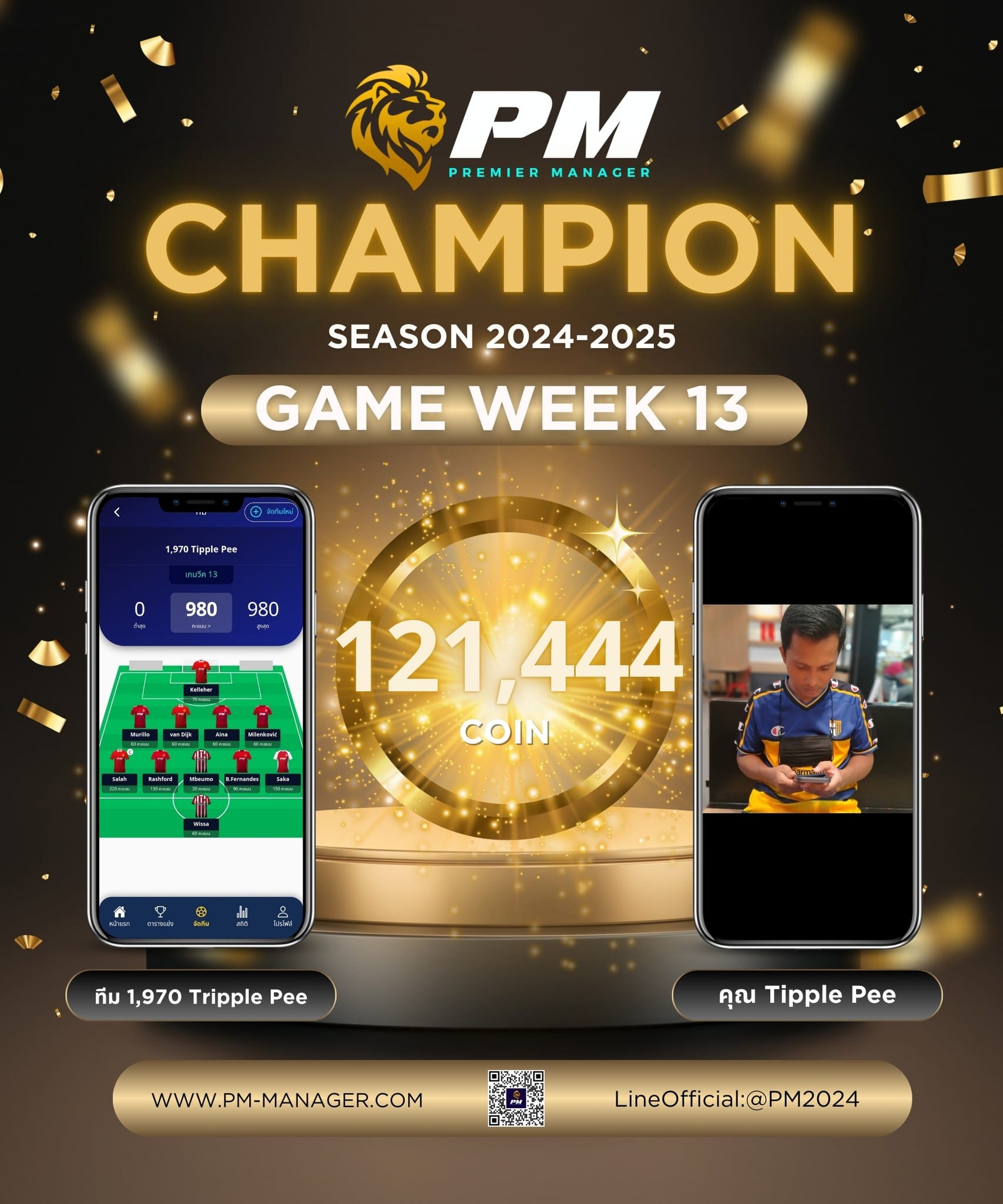 PM-Managerประกาศผู้ชนะฟุตบอลแฟนตาซี ประจำสัปดาห์ที่ 13 โดยเป็นทีม 1,970 Tipple Pee ที่ทำได้ 980 คะแนนในสัปดาห์นี้