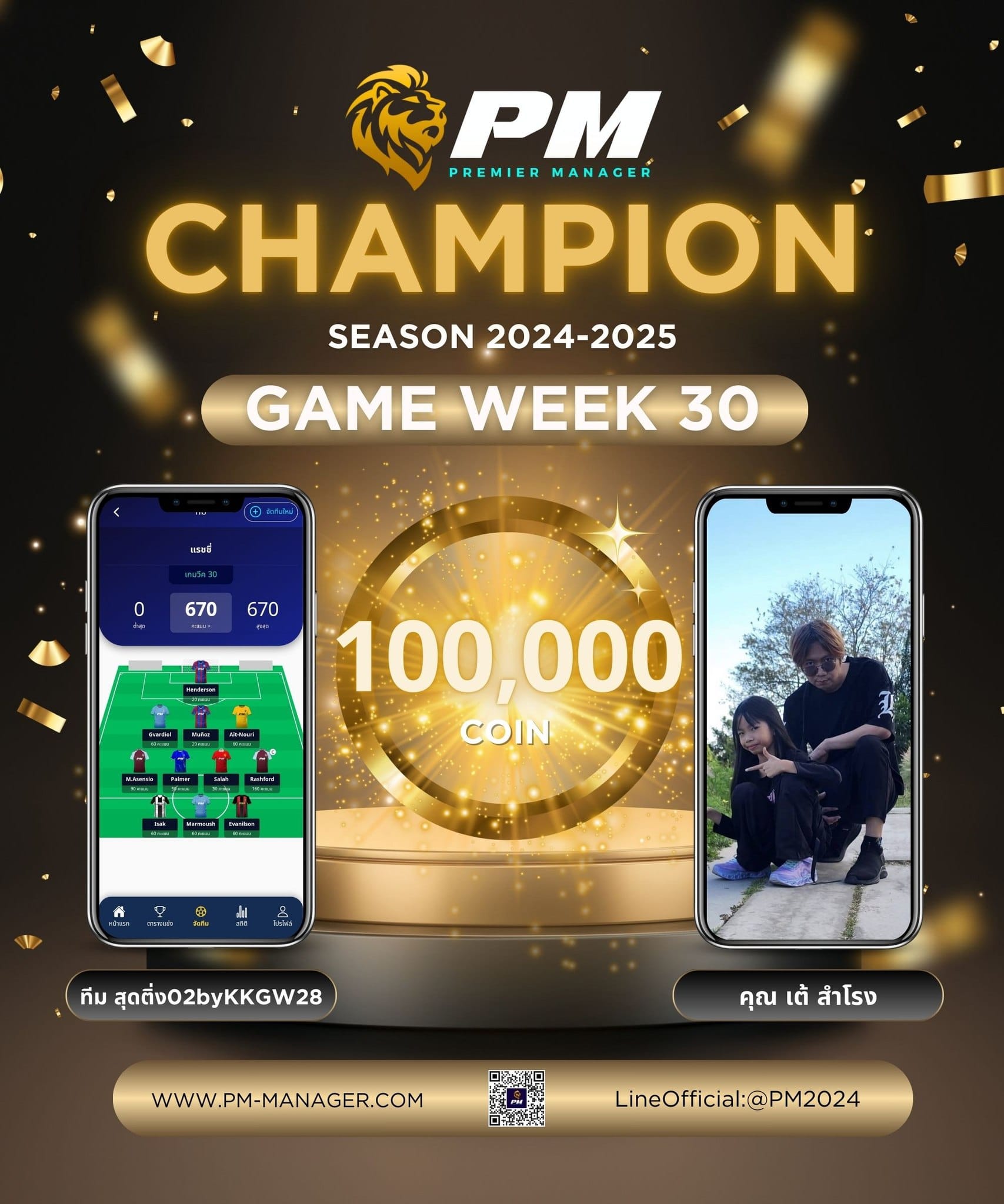 PM-Manager เกมวีคที่ 30 (GW30) ได้ผู้ชนะไปเป็นที่เรียบร้อย ได้แก่ทีม แรชชี่ ของคุณ เต้ สำโรง ที่โกยแต้มไป 670 คะแนนในสัปดาห์นี้ คว้ารางวัลจำนวน 106,048 coin ไปครอง