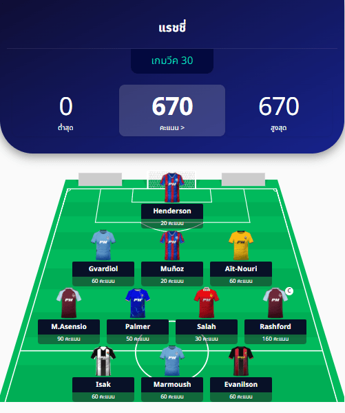 PM-Managerประกาศผู้ชนะฟุตบอลแฟนตาซี ประจำสัปดาห์ที่ 30 โดยเป็นทีม แรชชี่ ที่ทำได้ 670 คะแนนในสัปดาห์นี้