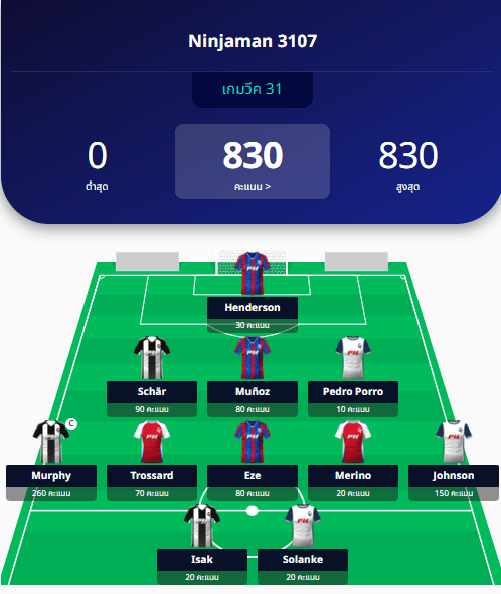 MID : (C)Murphy (นิวคาสเซิ่ล ยูไนเต็ด)+260 คะแนน, Trossard (อาร์เซน่อ)+70 คะแนน, Eze (คริสตัล พาเลซ) +80 คะแนน, Merino (อาร์เซน่อล)+20 คะแนน, Johnson (ท็อตแน่ม ฮ็อทสเปอร์) +150 คะแนน