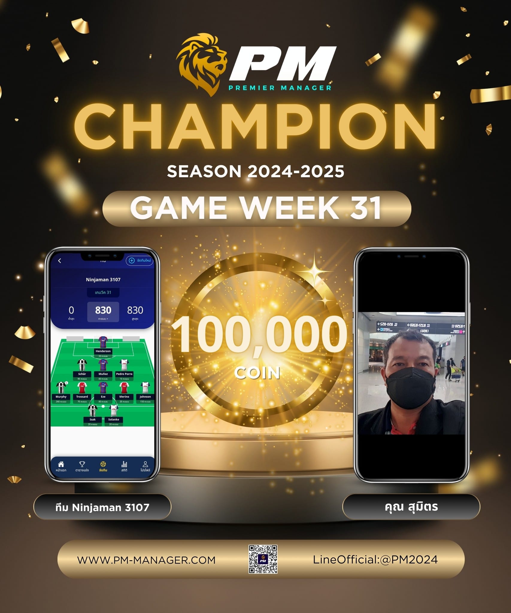 PM-Manager เกมวีคที่ 31 (GW31) ได้ผู้ชนะไปเป็นที่เรียบร้อย ได้แก่ทีม Ninjaman 3107 ของคุณ สุมิตร โสพรรณา ที่โกยแต้มไป 830 คะแนนในสัปดาห์นี้ คว้ารางวัลจำนวน 100,000 coin ไปครอง