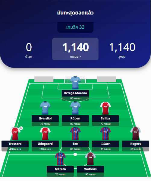 PM-Managerประกาศผู้ชนะฟุตบอลแฟนตาซี ประจำสัปดาห์ที่ 33 โดยเป็นทีม “มันกะสุดยอดแล้ว” ที่ทำได้ 1,140 คะแนนในสัปดาห์นี้