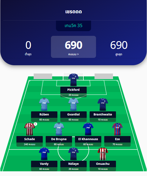 PM-Managerประกาศผู้ชนะฟุตบอลแฟนตาซี ประจำสัปดาห์ที่ 35 โดยเป็นทีม “เชรดดด” ที่ทำได้ 690 คะแนนในสัปดาห์นี้