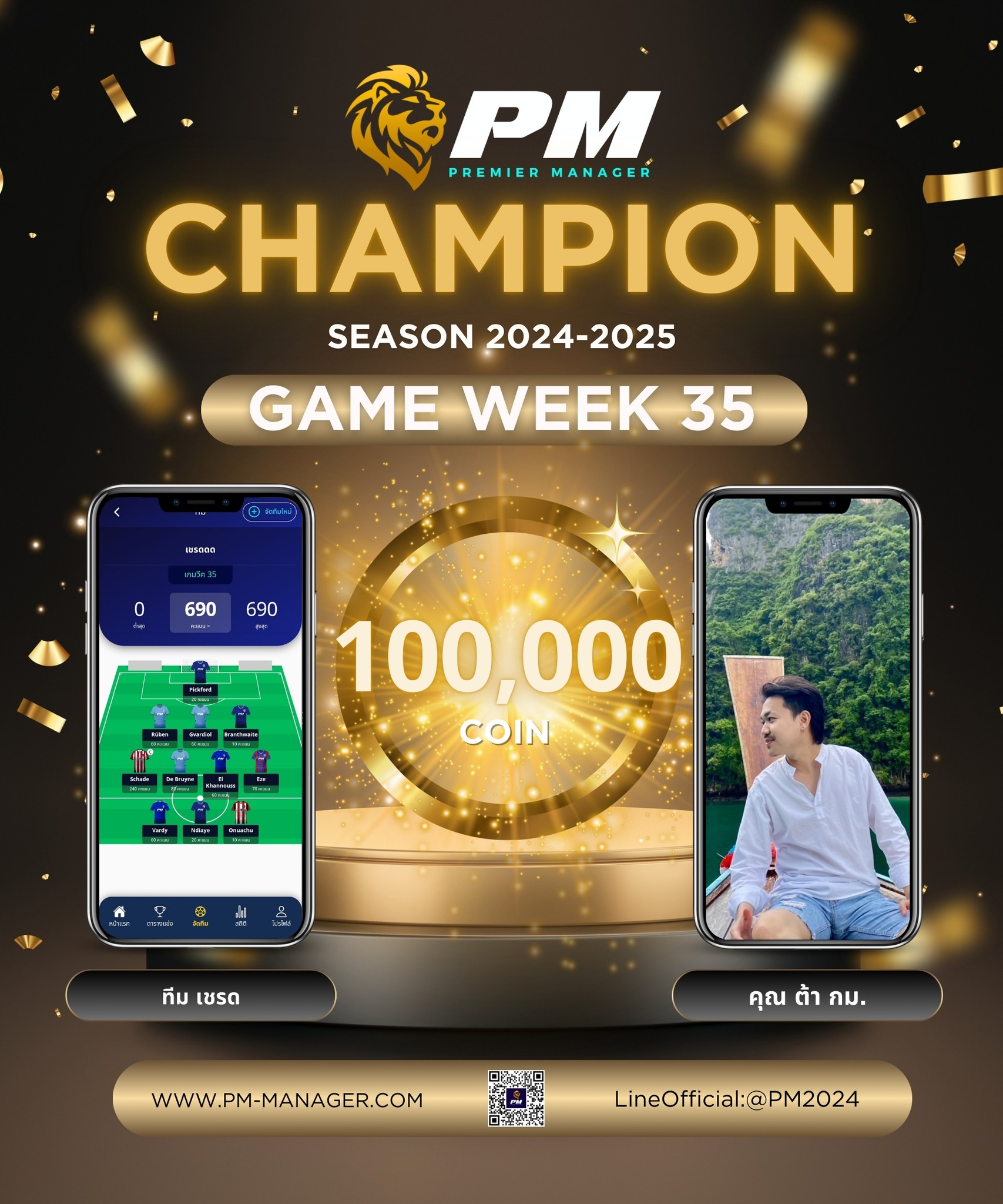 PM-Manager เกมวีคที่ 35 (GW35) ได้ผู้ชนะไปเป็นที่เรียบร้อย ได้แก่ทีม เชรดดด ของคุณ ต้า กม. ที่โกยแต้มไป 690 คะแนนในสัปดาห์นี้ คว้ารางวัลจำนวน 100,000 coin ไปครอง
