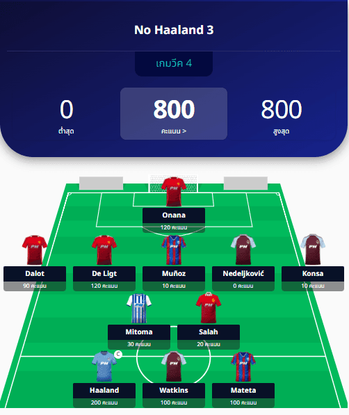 PM-Managerประกาศผู้ชนะฟุตบอลแฟนตาซี ประจำสัปดาห์ที่ 4 โดยเป็นทีม No Haaland 3 ที่ทำได้ 800 คะแนนในสัปดาห์นี้