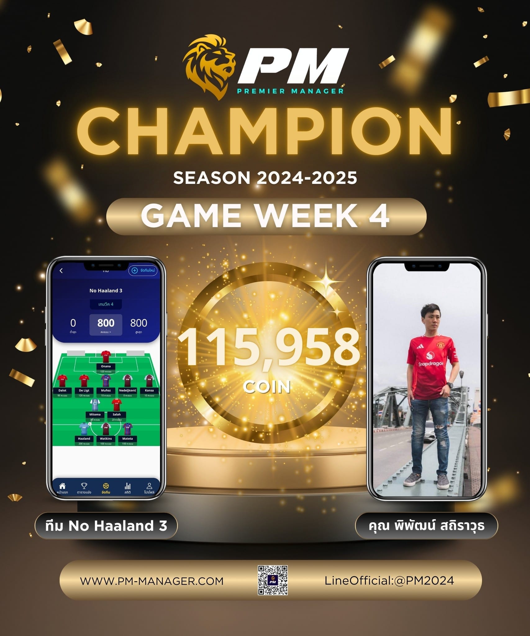 PM-Manager เกมวีคที่ 4 (GW4) ได้ผู้ชนะไปเป็นที่เรียบร้อย ได้แก่ทีม No Haaland 3 ของคุณ พิพัฒน์ สถิราวุธ ที่โกยแต้มไป 800 คะแนนในสัปดาห์นี้ คว้ารางวัลจำนวน 115,958 coin ไปครอง