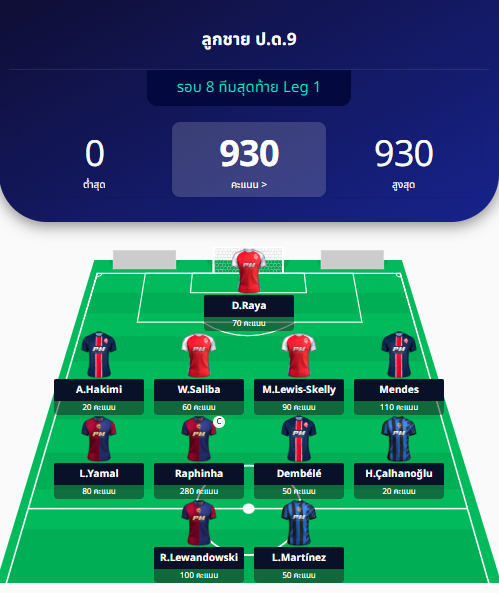 UCL PM-Manager ประกาศผู้ชนะรอบ 8 ทีมเกมที่ 1 โดยเป็นทีม ลูกชาย ป.ด.9 ที่ทำได้ 930 คะแนนในสัปดาห์นี้