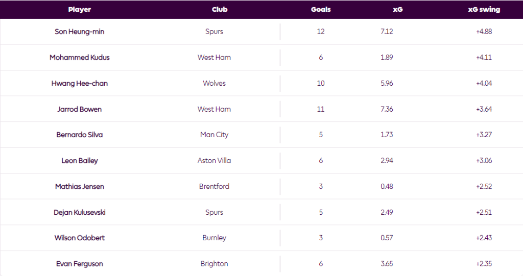 ซน ฮึง-มิน กัปตันทีมท็อตแน่ม ฮ็อตสเปอร์ กลับมาทำผลงานได้อย่างสุดยอดในฤดูกาลนี้ โดยสถิติแสดงให้เห็นว่าเค้าทำได้ดีเกินความคาดหวัง โดยแข้งทีมชาติเกาหลีใต้ทำประตูได้ 12 ประตูในพรีเมียร์ลีกฤดูกาลนี้ แม้มีค่าxGรวมเพียง 7.12 ก็ตาม