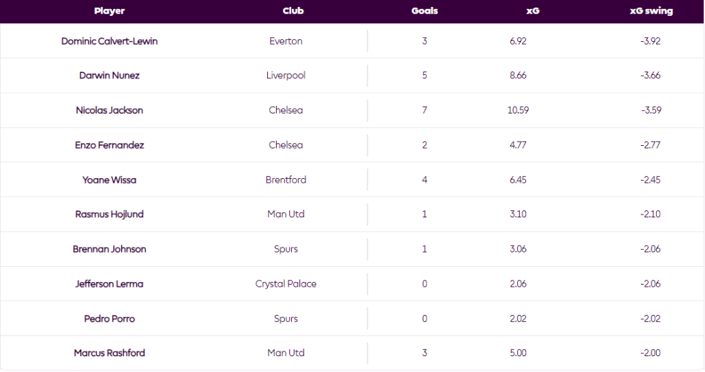 โดมินิก คัลเวิร์ต-ลูวิน ของเอฟเวอร์ตัน คือแข้งที่น่าผิดหวังที่สุด โดยทำผลงานได้ต่ำกว่าxG ของเค้าที่ -3.92 ในขณะที่ดาร์วิน นูเนซของลิเวอร์พูลตามหลังเขาด้วย -3.66